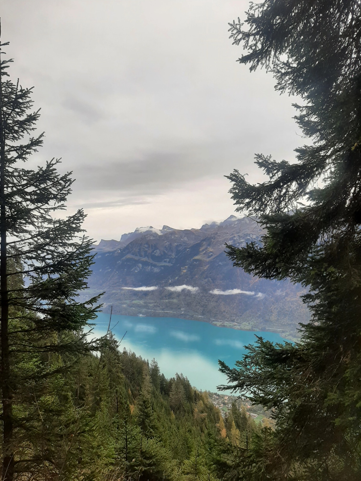 However while the view from platform was worth the trip up alone, it was not my primary reason for taking the funicular up. Several trails that lead further up the mountain start (or continue) from here as well. I headed north-east, following a trail up to the Augstmatterhorn. The plan was to see how far I would get, since the path offered multiple lines of descent back into Interlaken. The hike started off through a sometimes steep and slippery forest section in which the trees occasionally open up. When they do, a beautiful view of Lake Brienz below awaits you.
